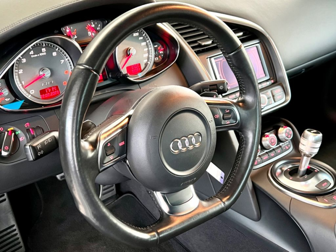 ABS,Airbag grand volume conducteur et passager AV avec niveaux de gonflement suivant la gravité du choc,Airbags latéraux tête et thorax,Alarme antivol avec protection antiremorquage incluant protection volumétrique de l’habitacle,Applications décoratives Gris micrométallique,Appuis têtes reglables,ASR,Audi Backguard Grâce à la forme particulière des sièges,Autoradio FM/AM avec lecteur CD (compatible MP3),Avertisseur sonore 2 tons,Boîte à gants verrouillable et éclairée,Calandre Singleframe laquée noir brillant,Carrosserie : architecture Audi Space Frame ASF,Ceintures à enrouleur 3 points,Ceintures AR latérales réglables en hauteur.,Ceintures de sécurité à prétensionneurs arriere réversibles (permet un resserrement préventif des ceinture de sécurité en cas de danger,Ceintures de sécurité AV réglables en hauteur,Cendrier et allume-cigares sur la console centrale,Châssis Sport,Ciel de pavillon en tissu noir ou gris lumière,Climatisation automatique sans CFC,Colonne de direction réglable en hauteur ou/et profondeur,Contrôle de pression des pneumatiques,Détecteur de luminosité,Déverrouillage du capot moteur,Direction électromécanique à assistance variable (asservie à la vitesse),EBV : Répartiteur électronique de freinage,Eclairage et catadioptres sur toutes les portières,Eclairage intérieur à extinction temporisée et contacteurs sur toutes les portières,Eclairage intérieur à temporisation avec contacteurs sur toutes les portières,Eclaireurs et catadioptres actifs sur toutes les portières,Ecrous antivol,EDS,ESP,Essuie-glace à intermittence réglable,Essuie-glaces 2 vitesses,Feux AR entièrement à diodes,Feux de brouillard AR,Feux de jour AV à diodes électroluminescentes (LED),Feux stop : 3ème feu stop à diodes,Fixation Isofix pour siege passager AV,Frein à main mécanique,Freinage : étriers fixes à 8 pistons à l’AV et à 4 pistons à l’AR,Grille de boîte de vitesses manuelle en H, en acier,idSAT: Systeme immobilisation et de localisation par satellite,Inscription R8 à sur l’AR du véhicule et sur le compte-tours,Instrumentation R8 spécifique gris micrométallique à éclairage réglable; comprend : indicateur de température de liquide de refroidissement et de température extérieure,Jantes alu coulé style 6 branches 8.5J x 18,Lave phares,Livre de bord avec étui en cuir,Lunette AR dégivrante, avec minuterie et antenne de vitre intégrée,MMI Unité de commande des réglages du véhicule ,Moquette et tapis complémentaires en velours, assortis à la couleur de l’habitacle,Moulures de seuils de portes avec insert d’aluminium et inscription R8,Outillage de bord dans le coffre,Pare-brise en verre athermique feuilleté avec bande de couleur grise sur la partie supérieure,Pare-chocs enrobé de synthétique, dans la couleur de carrosserie,Pare-soleil gauche et droite rabattables et orientables avec miroir de courtoisie éclairé,Pédalier et repose pieds style aluminium,Plafonnier à temporisation avec contacteur sur toutes les portières; éclairage côté passager AV et dans le coffre,Pommeau de levier de vitesse en aluminium,Porte-boissons double sur la console centrale,Prise 12V dans le coffre,Projecteurs antibrouillard halogènes sous verre transparent,Protection antidémarrage électronique avec code modifiable et activation auto par clé de contact,Protections latérale anticollision,Quattro, transmission intégrale permanente augmentant la motricité et la sécurité active,Régulateur de vitesse,Rétroviseur intérieur jour/nuit,Rétroviseurs extérieurs électriques,Sellerie en Cuir/Alcantara,Sellerie mixte Cuir/Alcantara: partie centrale des sièges en Alcantara,Sideblades : applications esthétiques verticales sur chaque flanc extérieur du véhicule,Sièges Sport avec bourrelets fortement marqués pour un meilleur maintien latéral en virage; réglage manuel pour appui-tête,Signal sonore pour oubli d’extinction des feux,Sortie d’échappement double à gauche et à droite (4 tubes style chromé),Spoiler AR escamotable asservi à la vitesse,Système d’information du conducteur avec montre et dateur; écran pour contrôle autocheck,Tableau de bord avec rembourrage de mousse et revêtement noir,Télécommande de verrouillage centralisé.,Témoins de contrôle pour Airbag,Tire Mobility System Compresseur et produit de colmatage pour les pneus; remplace roue de secours normale,Trappe à carburant en aluminium avec estampillage R8,Vérins pneumatiques sur le capot moteur et le capot de coffre,Vitres athermiques teintées vertes et pare-brise en verre feuilleté,Vitres électriques avec protection antipincement,Volant Sport multifonction en cuir style 3 branches, partie inférieure plate, avec airbag,Xénon Plus incluant lave-phares réglage automatique du site des phares