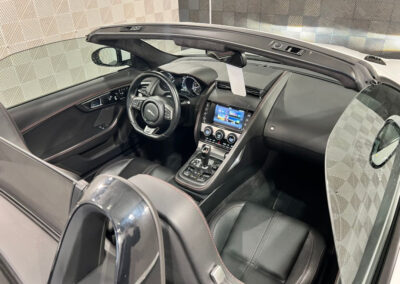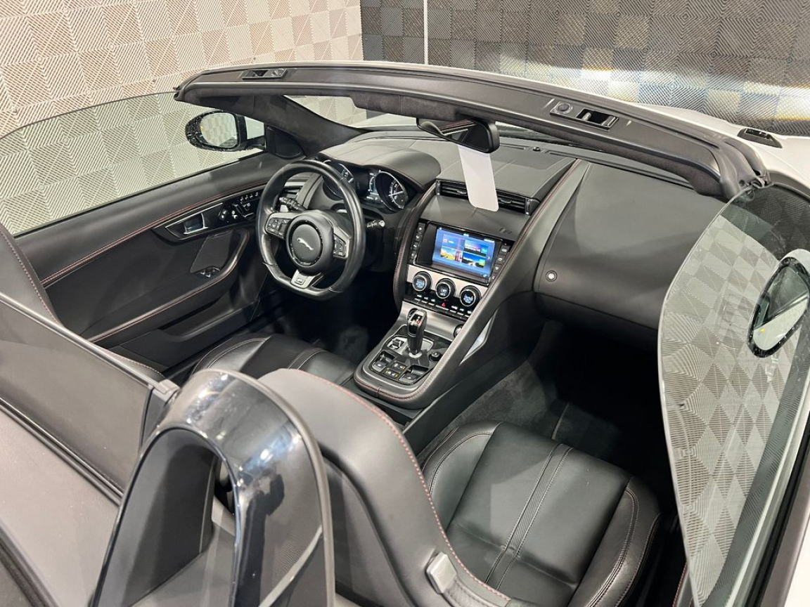 2 Prises 12V,Alarme périmétrique avec coupe-circuit intégré,Allumage automatique des phares,Arceaux de sécurité en finition Noir brillant,Climatisation automatique,Colonne de direction réglable électriquement,Console centrale Dark Technical Weave badgé R,Contrôle de stabilité DSC déverrouillable,Détecteur de pluie,Différentiel actif électronique avec Torque Vectoring,Double porte-verres,Dynamique de conduite configurable avec menu spécifique via l’écran tactile,Echappement Sport actif,Echappement Sport actif modulable depuis l’habitacle,Eclairage intérieur ambiant modulable 5 tons: du bleu phosphorescent au rouge,Ecran tactile 8,Essuie-glace AV automatiques avec détecteur de pluie,Etriers de freins Rouges,Filet de rangement entre les 2 sièges,Finition chromée des entourages de grille de calandre et des ouïes latérales,Finition Ignis sur les palettes du volant, les boutons de démarrage et de mode de conduite,Finition noire brillante sur les ouïes d’aération du capot,Frein de stationnement électronique avec desserrage automatique au démarrage,Freins Super Performance (380mm à l’AV et 376mm à l’AR) avec étriers noirs,Garniture de console en finition Dark Technical Weave Aluminium,InControl Protect,Interface média AV avec prises auxiliaires et prise USB,Jaguar Smart Key System avec démarrage sans clé,Jantes en alliage 20,Jantes en alliage 20,Kit de réparation de pneu Jaguar,Kit premier secours,Lève-vitre électrique à impulsion,Logo R sur l’AR,Lumière d’ambiance configurable (5 tons),Ordinateur de bord avec affichage central de 5,Pack Finition Cuir,Pavillon en Morzine Jet,Peinture vernie,Phares au Xénon avec feux de jour à LED et lave-phares/Feux AR à LED,Poignées de portes escamotables,Quadruple sortie d’échappement,Radio AM/FM avec lecteur de CD en façade compatible MP3,Réglages des sièges en 6×6 directions AV/AR manuel, inclinaison et hauteur électriques,Rétroviseur intérieur à inversion Jour/Nuit automatique,Rétroviseurs extérieures chauffants et réglables électriquement,Sélecteur de vitesses séquentiel avec palettes au volant,Sièges Performance R Cuir Premium,Spoiler AR à déploiement automatique,Spoiler déployable électriquement,Suspension R,Système ABS avec aide au freinage d’urgence et répartiteur électronique de la force de freinage,Système Audio Jaguar 190W avec 6HP,Système de contrôle de la pression des pneus (TPMS),Système de réparation de pneu Jaguar,Tapis de sol R,Tapis de sol R avec coutures contrastées,Technologie Stop/Start,Volant R avec palettes Ignis,Volant R en Cuir et palettes Argent