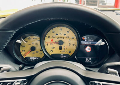 2 porte-gobelets côté passager derrière la baguette décorative du tableau de bord,Accoudoirs de portes et couvercle du coffre de rangement de la console cenrtrale avec révêtement en Cuir lisse,Affichage numérique: vitesse, rapport engagé, kilométrage total, journalier et heure,Aileron AR à déploiement automatique,Airbags grand volume conducteur et passager,Assistant d?éclairage automatique avec éclairage d?accompagnement,Baguettes de seuil de porte avec inscription du modèle,Blocs optiques supplémentaires à DEL dans le bouclier AV avec les feux de positions,Boîte de vitesse Porsche Doppelkupplung (PDK),Ciel de toit en tissu,Climatisation avec filtre à charbon actif intégré,Coffres AV et AR,Combiné d’instruments avec compte-tours central et écran couleur haute définition de 4.6,Concept de véhicule 2 places avec moteur central,Console centrale montante avec vide-poches ouvert et coffre de rangement fermé,Couronne du volant,Crochets porte-vêtement au dos des sièges,Dégivrage de lunette AR,Direction directe électromécanique à rapport variable et impulsion,Ecrous antivol,Essieu à jambes de force allégées à l’AV et à l’AR,Essuie-glaces de pare-brise avec balais d’essuie-glaces Aéro et buses de lave-glaces,Feux AR à DEL avec feux stop intégrés 4 points et feux de recul,Fonction ,Fonds des compteurs du combiné d’instruments en Noir compte-tours couleur Argent,Frein de parking électrique,Housses des sièges en Alcantara similicuir,Jantes Carrera S 20,Kit anti-crevaison avec compresseur électrique,Lève-vitres électriques à impulsion et abaissement automatique de la vitre,Ligne d’échappement à double flux avec double sortie centrale en Acier spéciale,Pédales et repose-pieds au design Sport,Phares Bi-Xénon avec feux de jour à DEL intégrés,Porsche Communication Management (PCM) avec pré-équipement pour téléphone portable et interface audi,Porsche Side Impact Protection System (POSIP) comprenant : protection anti-encastrement latérale dans les portes,Porsche Stability Management (PSM), ABS inclus avec fonctions de freinage avancées,Prise 12 Volts dans le plancher côté passager,Propulsion,Réservoir de carburant de 64 litres,Rétroviseurs extérieurs sur panneaux de portes,Sièges Sport avec réglage électrique du dossier et réglage manuel de la profondeur et de la hauteur,Sièges sport Plus (2 réglages électriques),Signature Porsche sur baguette décorative et désignation du modèle sur le bouclier AR,Sound Package Plus,Spots de lecture,Structure légère intélligente combinant l’aluminium et l’acier,Système anti-démarrage avec verrouillage centralisé et télécommande,Système d’alarme,Système de contrôle de la pression des pneus (TPM),Système de freinage renforcé, étriers de freins rouge,Touche Sport pour activation des réglages dynamiques du moteur et de la transmission,Ventilation avec fonction recyclage et dégivrage,Vide-poches dans les portières,Vitrage athermique teinté vert,Volant Sport GT