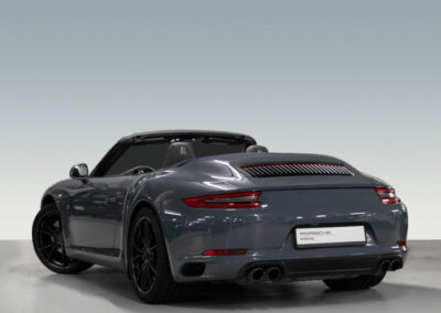 2 porte-gobelets côté passager derrière la baguette décorative du tableau de bord,Affichage numérique: vitesse, rapport engagé, kilométrage total et journalier,Aileron AR à déploiement automatique,Airbags grand volume conducteur et passager,Assistance parking AR,Assistant d?éclairage automatique avec éclairage d?accompagnement,Baguettes de seuil de porte avec monogramme,Bandes centrales des sièges AV,Blocs optiques supplémentaires à DEL dans le bouclier AV avec les feux de positions,Boîte de vitesse Porsche Doppelkupplung (PDK),Cadrans du combiné d’instruments de couleur Noir et compte-tours de couleur Argent,Capote en tissu entièrement électrique et automatique avec 3 éléments en magnésium intégrés et une lunette AR chauffante électrique,Ciel de capote en tissu Noir,Climatisation automatique bi-zone avec réglage individuel de la température pour le conducteur et le passager AV,Coffre à l’AV,Combiné d’instruments avec compte-tours central et écran couleur haute définition de 4.6,Connect Plus,Console centrale montante avec vide-poches ouvert et un autre fermé,Couronne de volant,Crochets porte-vêtement au dos des sièges et sur les montants centraux,Différentiel AR avec vecteur de couple PTV,Direction assistée électromécanique variable et impulsion,Equipements de série Teintes disponibles : Noir,Essieu AR multibras,Essieu AV McPherson,Essuie-glaces de pare-brise avec balais d’essuie-glaces Aéro et buses de lave-glaces,Etriers fixes monobloc en aluminium à 6 pistons à l’AV et 4 pistons à l’AR,Feux AR à DEL en 3 dimensions avec feux stop intégérs 4 points,Filtres à particules et à pollen avec filtre à charbon actif,Fonction ,Frein de parking électrique,Jantes Carrera S 20,Kit anti-crevaison avec compresseur électrique,Lève-vitres électriques à impulsion et abaissement automatique de la vitre,Ligne d’échappement à quatre flux avec 2 double sorties en Acier spécial,Logements pour système de fixation de siège enfant ISOFIX et Top-Tether sur les sièges AR,Lunette AR dégivrante,Phares Bi-Xénon avec feux de jour 4 points à DEL intégrés,Porsche Active Suspention Management (PASM) surbaissé de 10 mm,Porsche Communication Management (PCM) avec module de navigation,Porsche Side Impact Protection System (POSIP) comprenant : protection anti-encastrement latérale dans les portes,Porsche Stability Management (PSM), ABS inclus avec fonctions de freinage avancées,Prise 12 Volts dans le plancher côté passager,Prises d’air latérales AV avec lamelles avec volets d’air de refroidissement actifs et airblades,Rétroviseurs extérieurs sur panneaux de portes,Saute-vent électrique intégré,Sièges AR rabattables séparément,Sièges Sport avec réglage électrique des dossiers et de la hauteur,Sièges sport plus ou baquet en cuir Gris Quartz,Signature Porsche et monogramme du modèle sur le bouclier AR, chromé, finition brillante,Sound Package Plus: Système audio analogique 9HP d’une puissance de 235W,Spots de lecture,Structure légère intélligente combinant l’aluminium et l’acier,Système anti-démarrage avec verrouillage centralisé et télécommande,Système d’admission à expansion,Système de contrôle de la pression des pneus (TPM),Teintes de capote : Noir, Bleu, Brun, Rouge,Teintes unies – Extérieur : Blanc, Jaune Porsche Racing, Rouge Indien et Noir,Touche Sport pour activation des réglages dynamiques du moteur et de la transmission,Vide-poche dans les portières,Vitrage athermique teinté vert,Volant Sport diamètre de 375 mm, réglable manuellement en profondeur et en hauteur